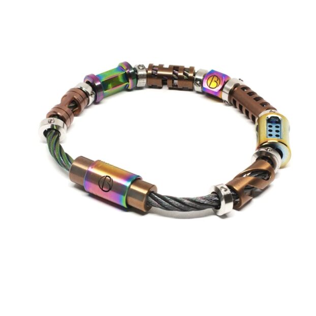 Rainbow PVD is a truly unique multicoloured coating, with each piece having its own mix of Rainbow colours featuring stunning blends of Greens, Pinks, Yellows and Purples. This unusual coating was developed to be “one of a kind”, a truly distinctive process where no two bracelets will ever look the same. The advanced coating is created by an Arc deposition process where lightning is tightly controlled in such a way to evaporate a titanium ceramic alloy onto the parts to create a colourful, hard wearing and durable product that will stand the test of time.