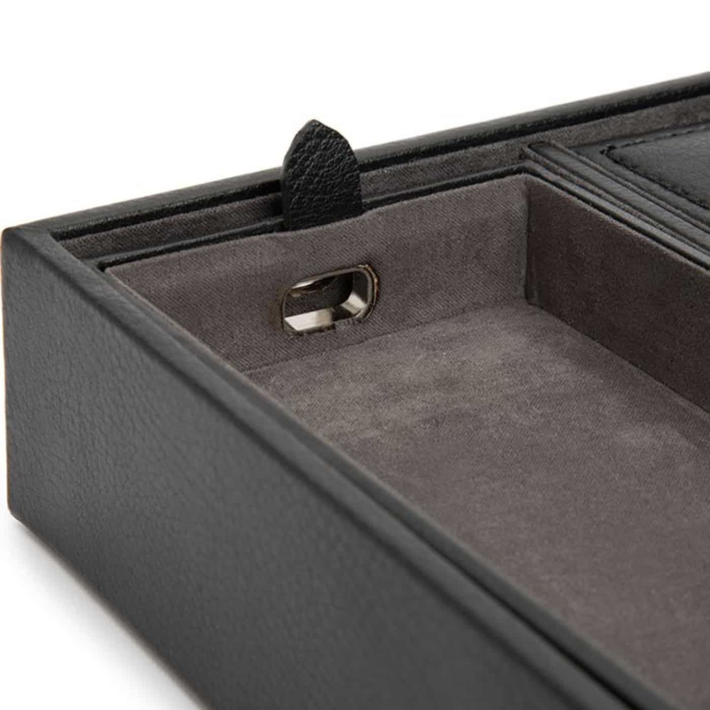 The Blake Valet tray by WOLF brings elegant styling together with quality build, craftsmanship and materials. Shown here with a high quality black vegan leather exterior and grey ultrasuede interior featuring an interchangeable cuff (with Blake/Heritage Watch Rolls) to hold up to 3 watches and both covered & uncovered compartments to store smaller items such as jewellery, cuff links, coins and keys
