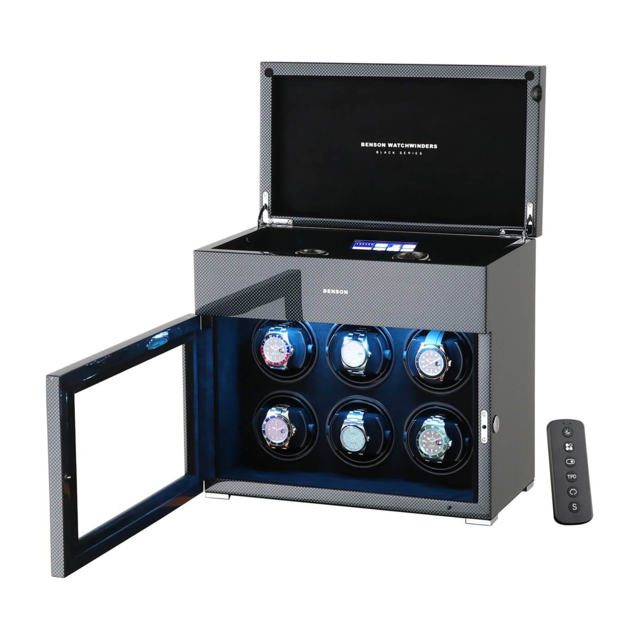 It is suitable for winding 6 automatic watches and offers storage space for 5 further watches. By operating the touchscreen, you choose the direction of rotation and the number of revolutions per day (TPD). This Benson Black Series II watch winder is equipped with high-quality Japanese motors, a remote control, start/stop system when you open the door, multi-colour LED lighting and speed winding. The motors start and stop neatly in the 12 o’clock position.