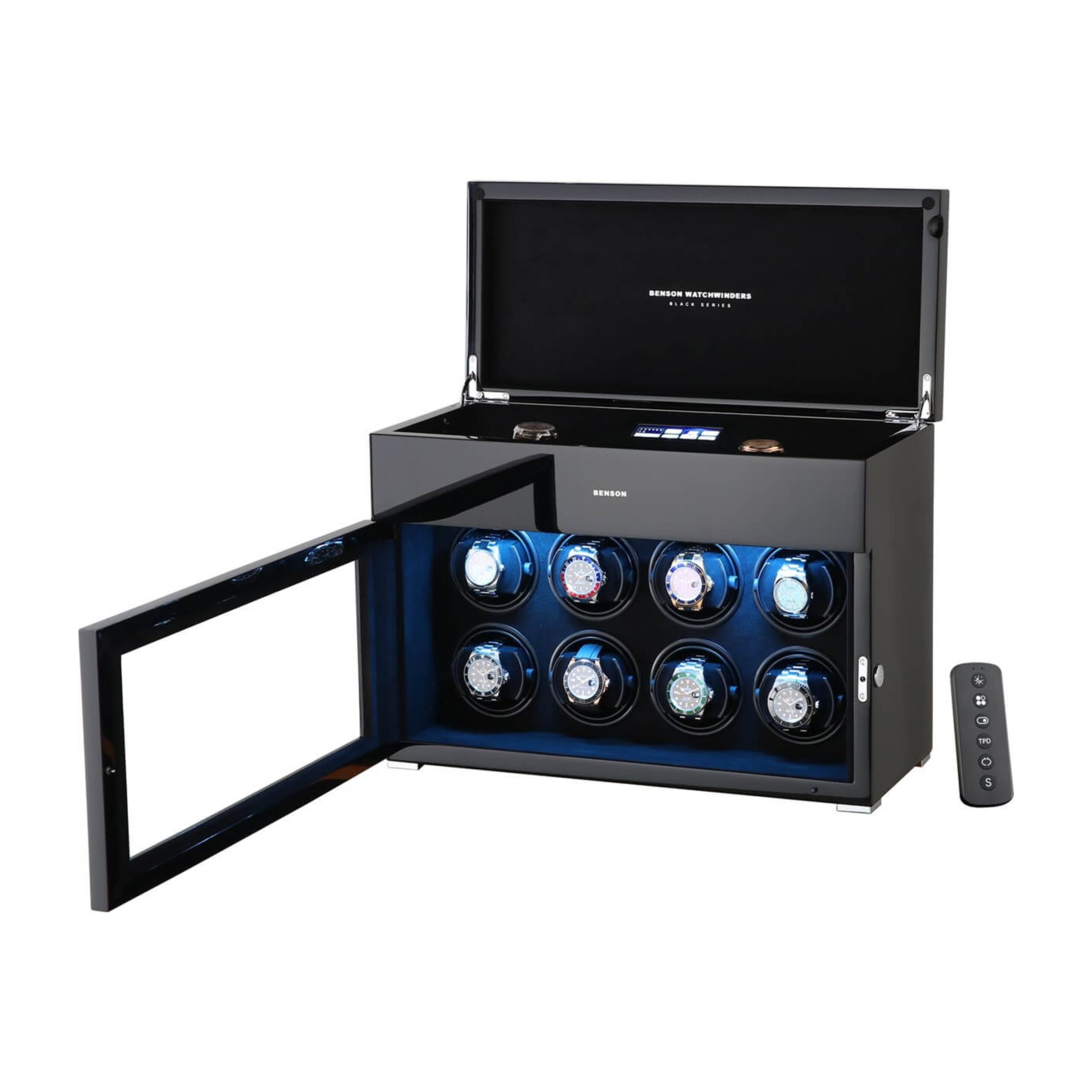 It is suitable for winding 8 automatic watches and offers storage space for 6 further watches. By operating the touchscreen, you choose the direction of rotation and the number of revolutions per day (TPD). This Benson Black Series II watch winder is equipped with high-quality Japanese motors, a remote control, start/stop system when you open the door, multi-colour LED lighting and speed winding. The motors start and stop neatly in the 12 o’clock position.