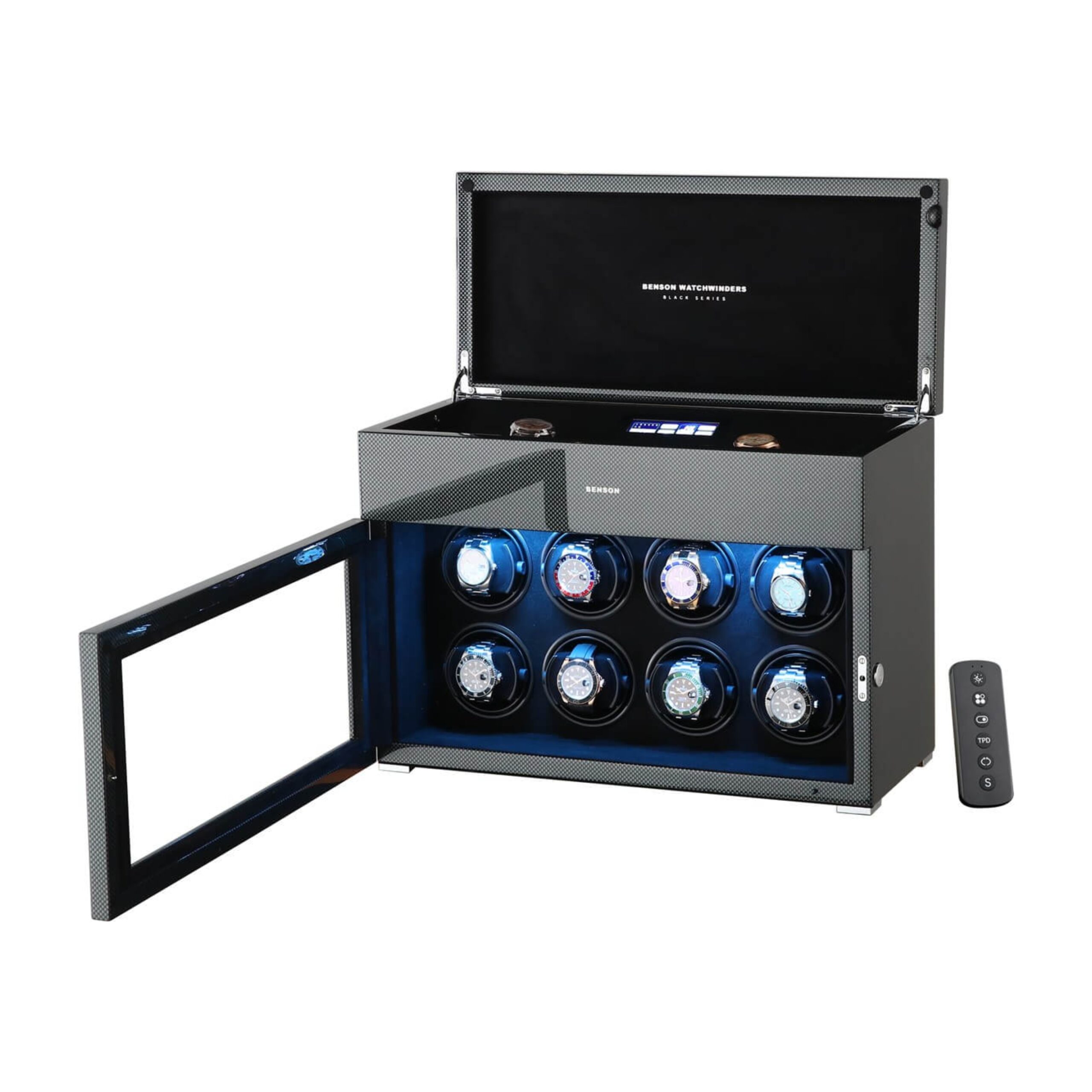 It is suitable for winding 8 automatic watches and offers storage space for 6 further watches. By operating the touchscreen, you choose the direction of rotation and the number of revolutions per day (TPD). This Benson Black Series II watch winder is equipped with high-quality Japanese motors, a remote control, start/stop system when you open the door, multi-colour LED lighting and speed winding. The motors start and stop neatly in the 12 o’clock position.