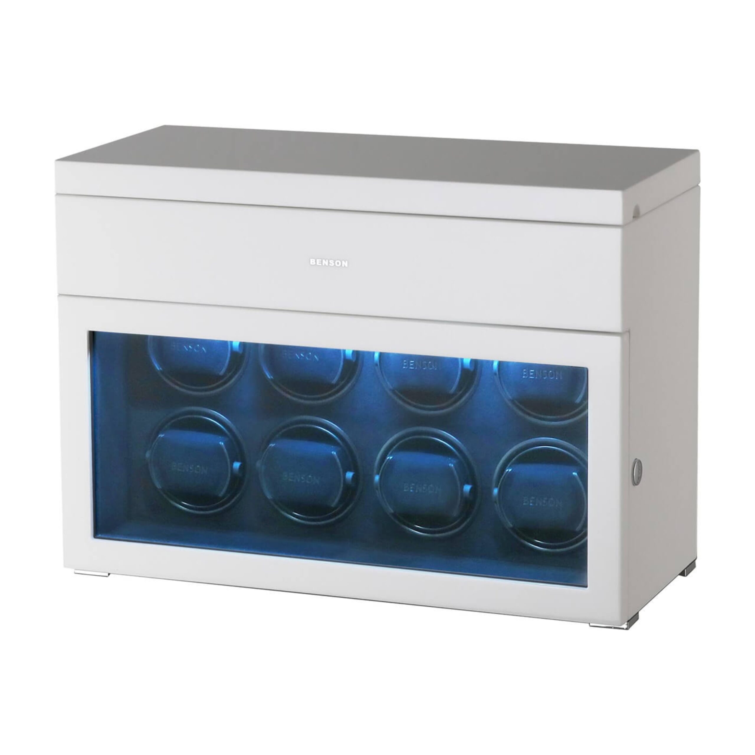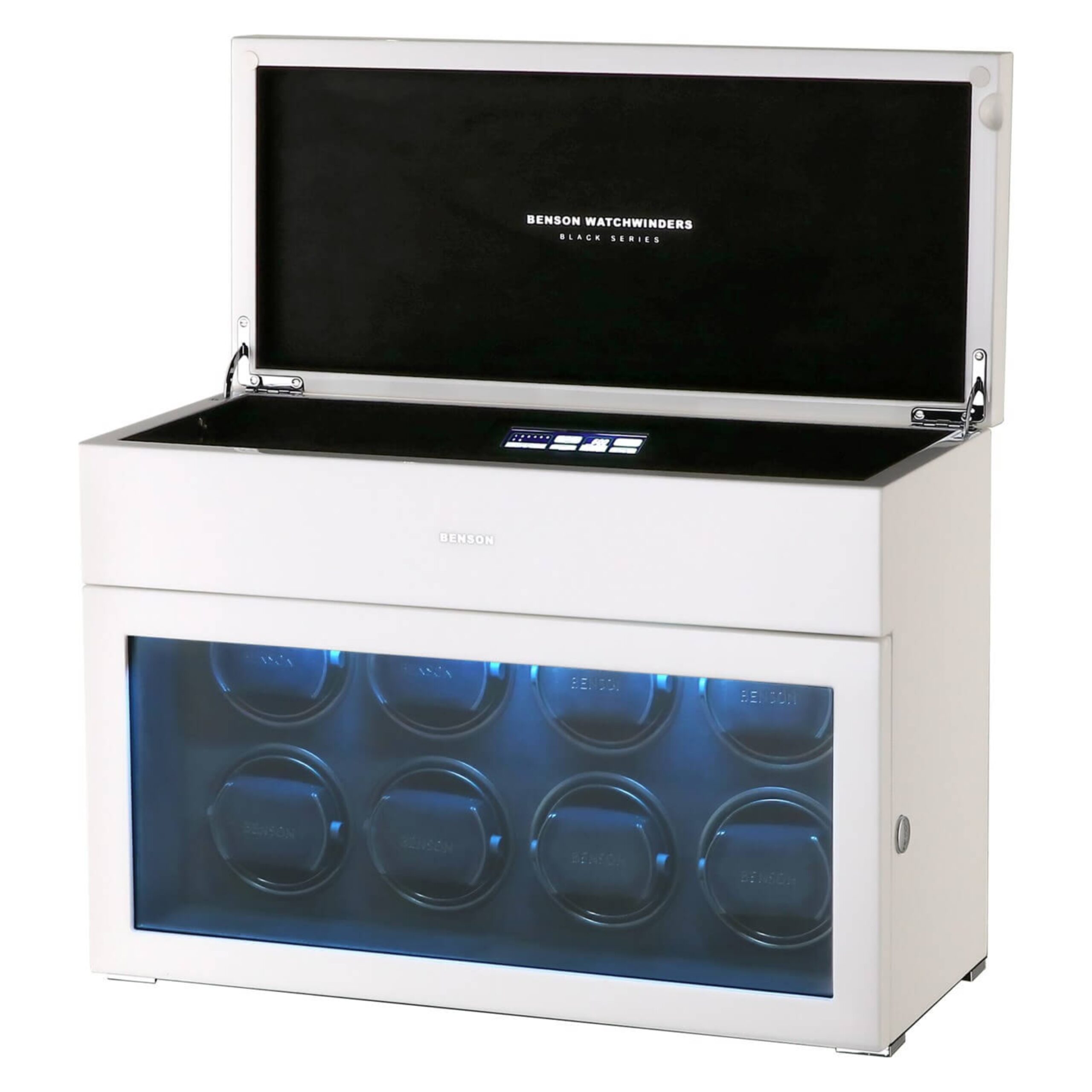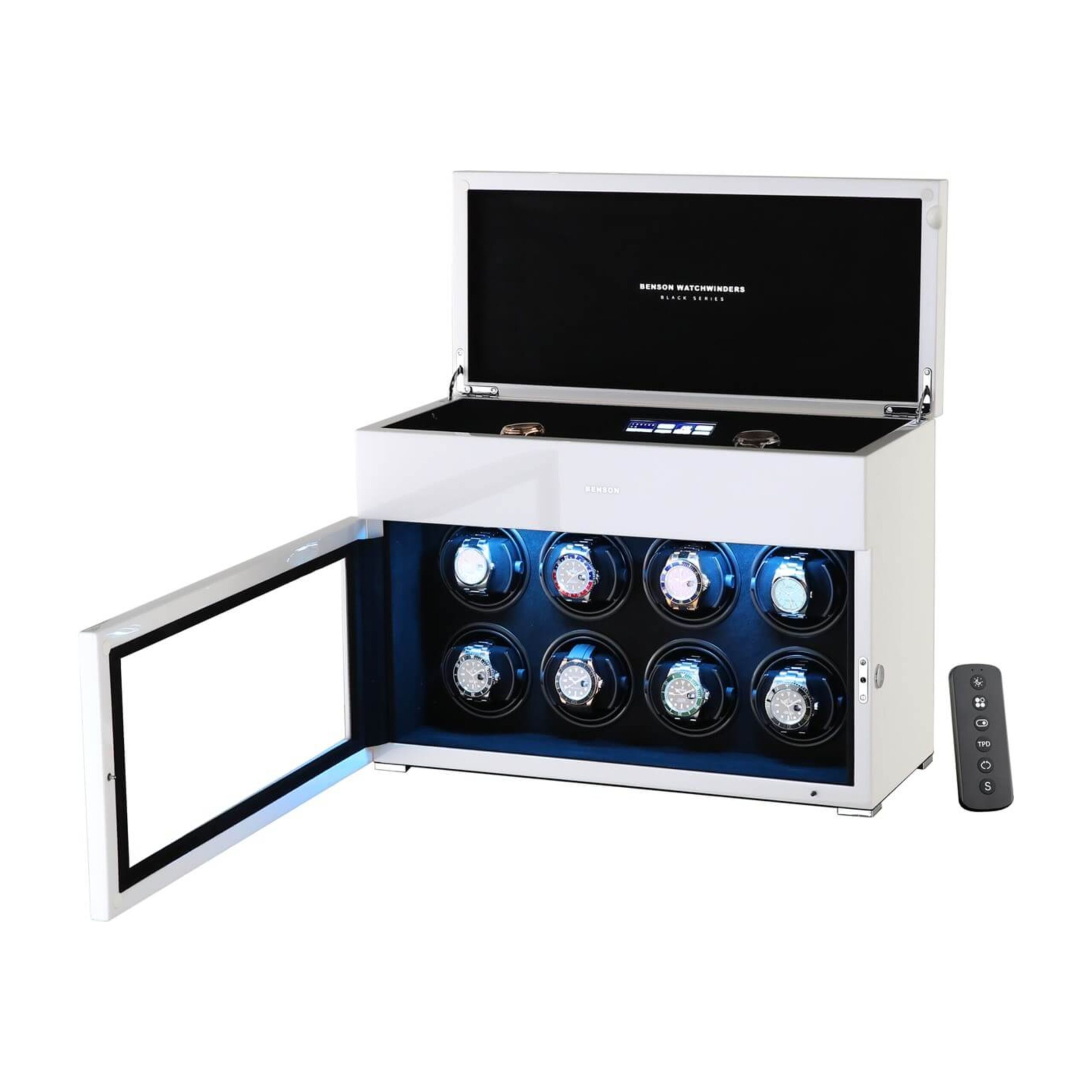 It is suitable for winding 8 automatic watches and offers storage space for 6 further watches. By operating the touchscreen, you choose the direction of rotation and the number of revolutions per day (TPD). This Benson Black Series II watch winder is equipped with high-quality Japanese motors, a remote control, start/stop system when you open the door, multi-colour LED lighting and speed winding. The motors start and stop neatly in the 12 o’clock position.