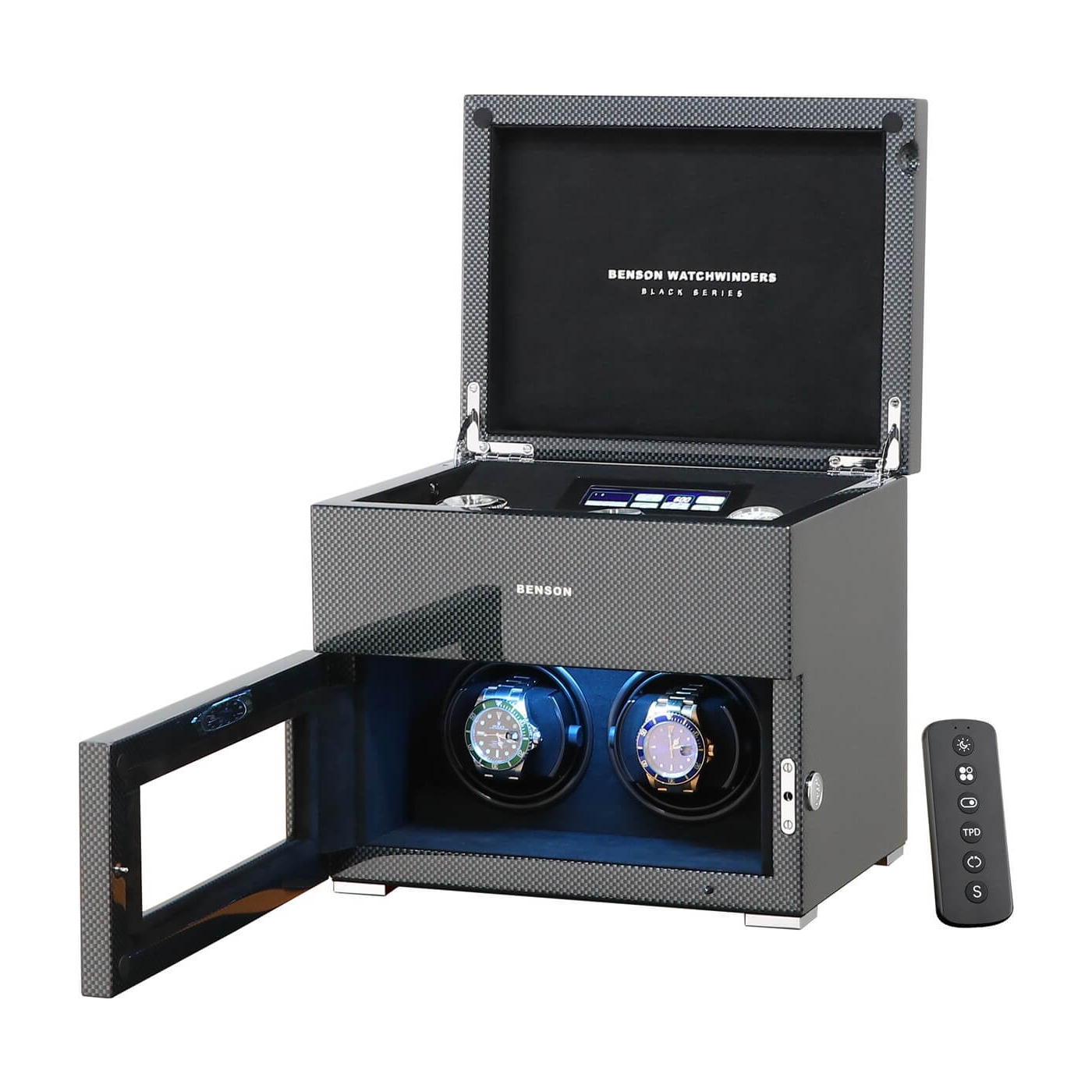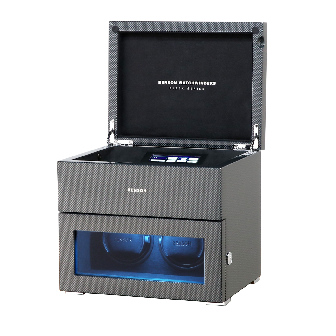 The new Benson Black Series II watch winders feature the latest technology and functionalities to provide any automatic watch, regardless of brand or model, with energy in a completely safe and professional manner. The Benson Black Series II watch winders are made entirely by hand and have a beautiful appearance. This model, the Benson Black Series II Double watch winder in Carbon, is suitable for winding 2 automatic watches and offers storage space for 3 other watches. By operating the touchscreen, you choose the direction of rotation and the number of revolutions per day (TPD). This Benson Black Series II watch winder is equipped with high-quality Japanese motors, remote control, start/stop system when you open the door, multi-colour LED lighting and speed winding. The motors start and stop neatly in the 12 o’clock position. The unique combination of high-quality technology and extensive functions make this Benson Black Series II double watch winder the best choice for winding 2 automatic watches. Watch the video for a complete overview of this beautiful watch winder.