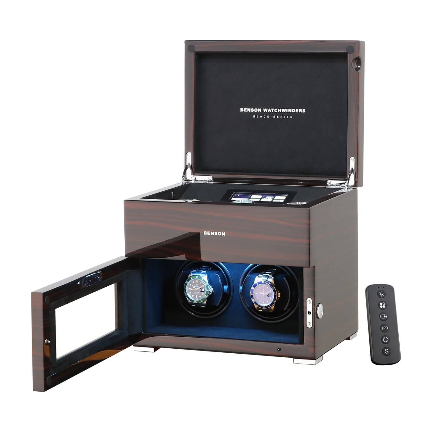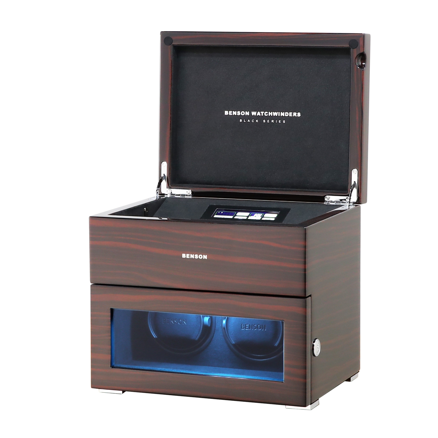 The new Benson Black Series II watch winders feature the latest technology and functionalities to provide any automatic watch, regardless of brand or model, with energy in a completely safe and professional manner. The Benson Black Series II watch winders are made entirely by hand and have a beautiful appearance. This model, the Benson Black Series II Double watch winder in Macassar, is suitable for winding 2 automatic watches and offers storage space for 3 other watches. By operating the touchscreen, you choose the direction of rotation and the number of revolutions per day (TPD). This Benson Black Series II watch winder is equipped with high-quality Japanese motors, remote control, start/stop system when you open the door, multi-colour LED lighting and speed winding. The motors start and stop neatly in the 12 o’clock position. The unique combination of high-quality technology and extensive functions make this Benson Black Series II double watch winder the best choice for winding 2 automatic watches. Watch the video for a complete overview of this beautiful watch winder.